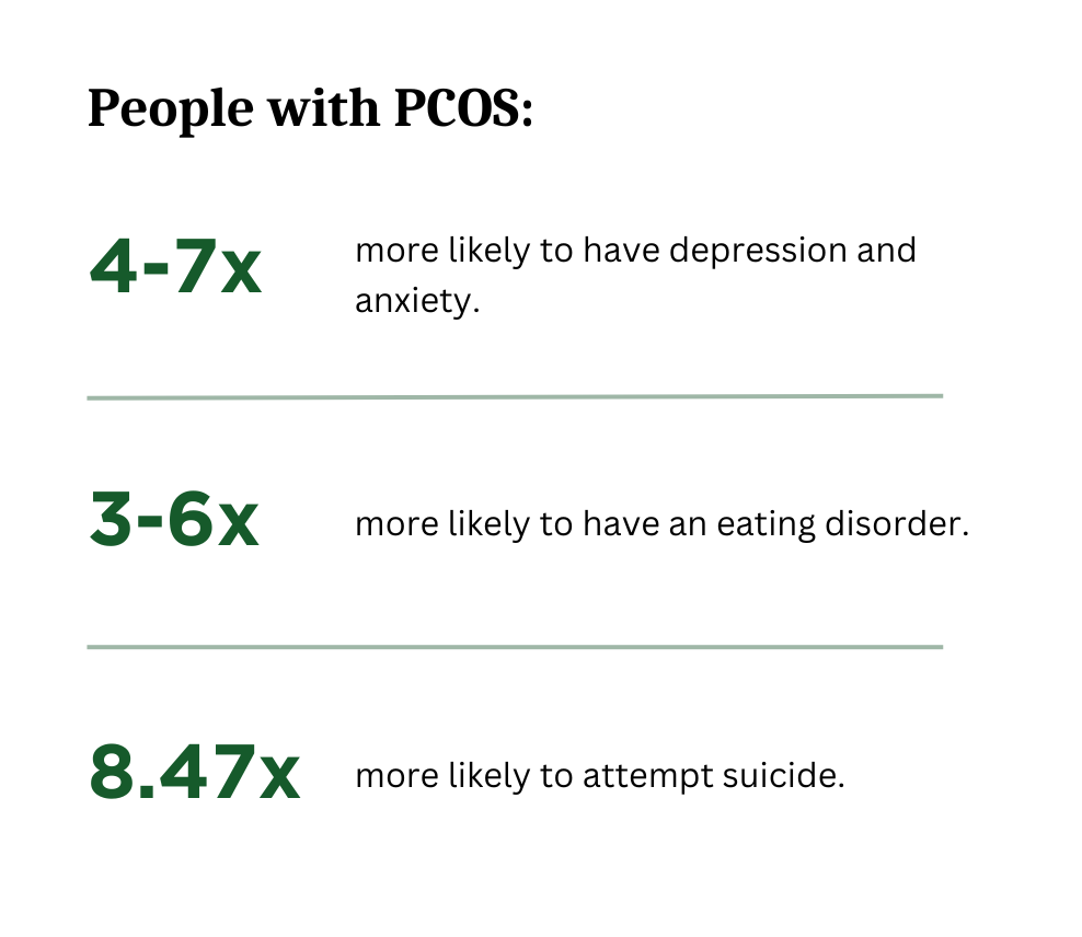 Recent studies have shown that people with PCOS are 4-7 times more likely to have depression and anxiety, 3-6x more likely to have an eating disorder, and 8.47x more likely to attempt suicide (The Guardian, 2024).